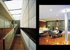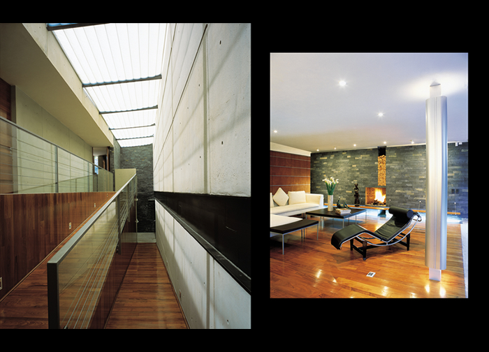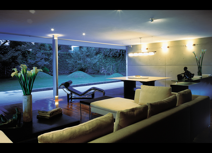 El proyecto se rige por principios básicos en cuanto a la pureza de las formas y la funcionalidad de los espacios que dan como resultado una sutil armonía. En contraste con el hermetismo de la fachada a la calle, al cruzar la puerta de entrada se establecen una serie de recorridos a través de una rampa en los que se intercalan espacios habitables que se unen con el espacio exterior. La fachada interior, de gran transparencia y flexibilidad, permite que los espacios internos se extiendan hasta los límites visuales del terreno, logrando que el jardín pueda diluirse y pasar a formar parte de estos espacios.
