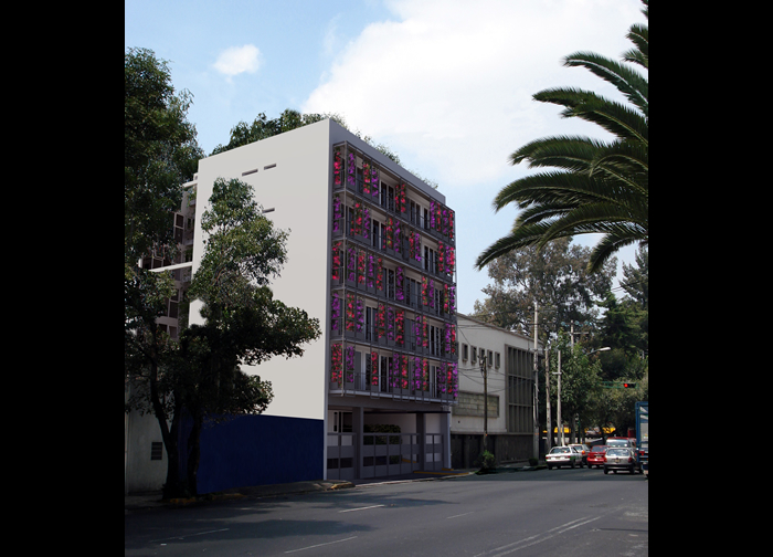 El edificio en sí actúa como un gran filtro purificador. Cada una de las fachadas que conforman su estructura juega un importante papel sustentable, funcional y estético. La fachada principal genera un interesante juego de paneles móviles de diferentes colores y texturas que actúan como un filtro de la contaminación exterior como el polvo y el ruido de la calle. Al mismo tiempo, esta fachada ayuda a controlar la temperatura interna de los departamentos y da flexibilidad y privacía a los espacios expuestos. Las fachadas internas están delimitadas por dos jardines verdes verticales que conforman el límite de la circulación vertical y que funcionan como un gran filtro del agua pluvial que se recolecta en la azotea y que la canalizan a una cisterna alterna para su almacenamiento para diversos usos del edificio. La azotea se convierte en un gran jardín común con ocho espacios privados que promueven la convivencia al aire libre. Este espacio superior minimiza el efecto negativo de las llamadas “islas de calor” en la ciudad.