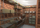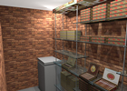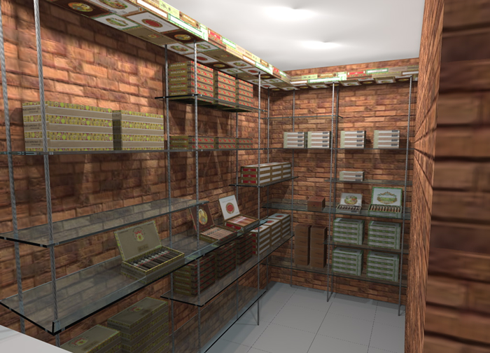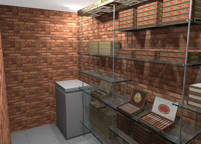 El mueble se diseño únicamente con cajas de puros recicladas, y con ellas se formo una estructura a manera de una caja ensamblada empotrada en la parte superior a los muros de tabique de demolición. De esta caja se desprenden cables de acero inoxidable que se tensan al piso y que tienen diversos soportes para recibir vidrios templados de diferentes tamaños y en diferentes ángulos que sirven de repisas para almacenar y exponer las cajas con los diferentes puros.