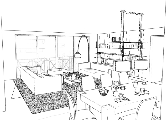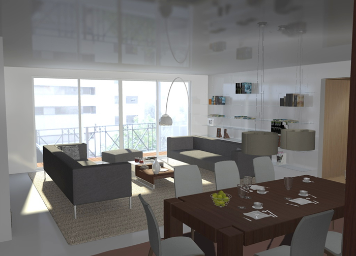 La idea principal del proyecto es generar una imagen totalmente nueva en cuanto a la solución estética del espacio a intervenir. El concepto plantea generar espacios continuos con materiales selectos que definan cada una de las tres zonas del departamento: La zona pública en un material blanco reflejante, la zona privada en madera opaca y la zona de los servicios en un gris granulado.